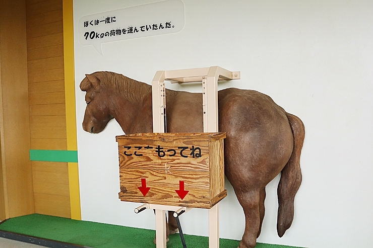 まきば館2階の野間馬ものしり教室では、農耕の際に野間馬が運んでいた荷物の重さを体感できます。